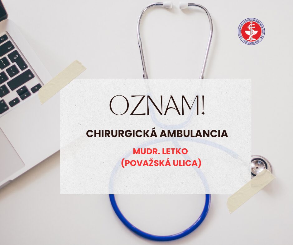 Oznamujeme Vám, že chirurgická ambulancia MUDr. Tibora Letka (na Považskej ul.) nebude v termíne od 1. 4. do 30. 4. 2026 ordinovať.